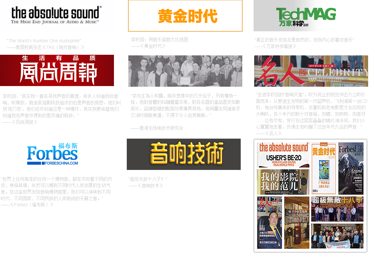 2007年底,美國著名音響雜志主編Robert Harley慕名而來,參觀了世界發燒音響博物館。經過認真的觀摩后,Robert Harley被李先生龐大的音響器材和唱片收藏量深深折服。感嘆之余,他贈言“The World’s Number One Audiophile”給李先生,并發表專訪文章介紹了這位潛藏在中國陽江的“世界第一發燒友”。